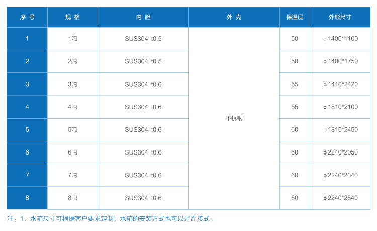 不銹鋼圓形保溫水箱 1、整板焊接,氬弧焊工藝,焊縫防腐性能強。 2、保溫采用整體發(fā)泡工藝,確保熱量低散失。 3、可根據(jù)用戶要求調(diào)整相關(guān)參數(shù)。